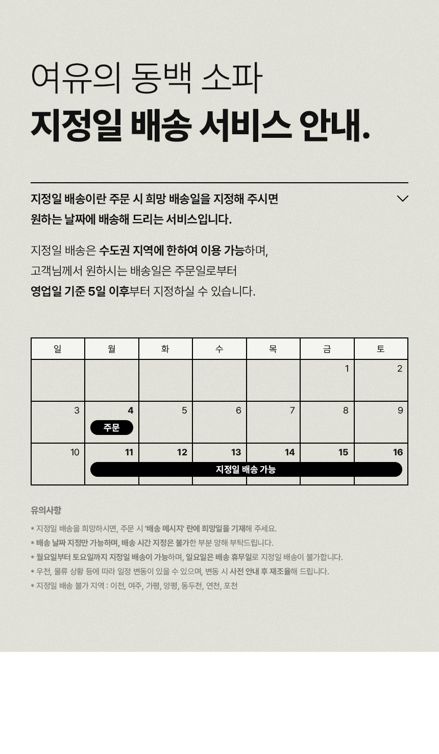 - 본 상품의 평균 배송일은 서울,경기 수도권은 7~10일, 지방은 7~15일 소요되고 있습니다.(공휴일 제외, 영업일 기준)(※기상악화 없을 시)